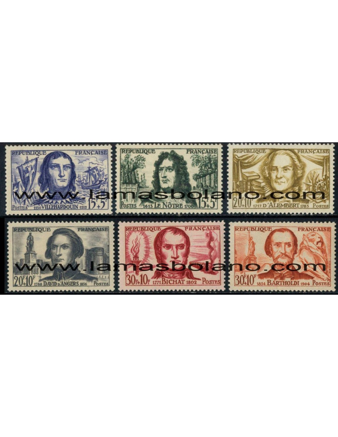 CELEBRIDADES (Geoffroi de La Villehardouin, André Le Nôtre y vista del parque de Versailles, Jean d'Alembert, David d'Angers su estatua y el castillo del rey René en Angers, Xavier Bichat, Frédéric-Auguste Bartholdi y sus obras con la estatua de la Libertad en Nueva Yowk y el León de Belfort) - Dentado 13
