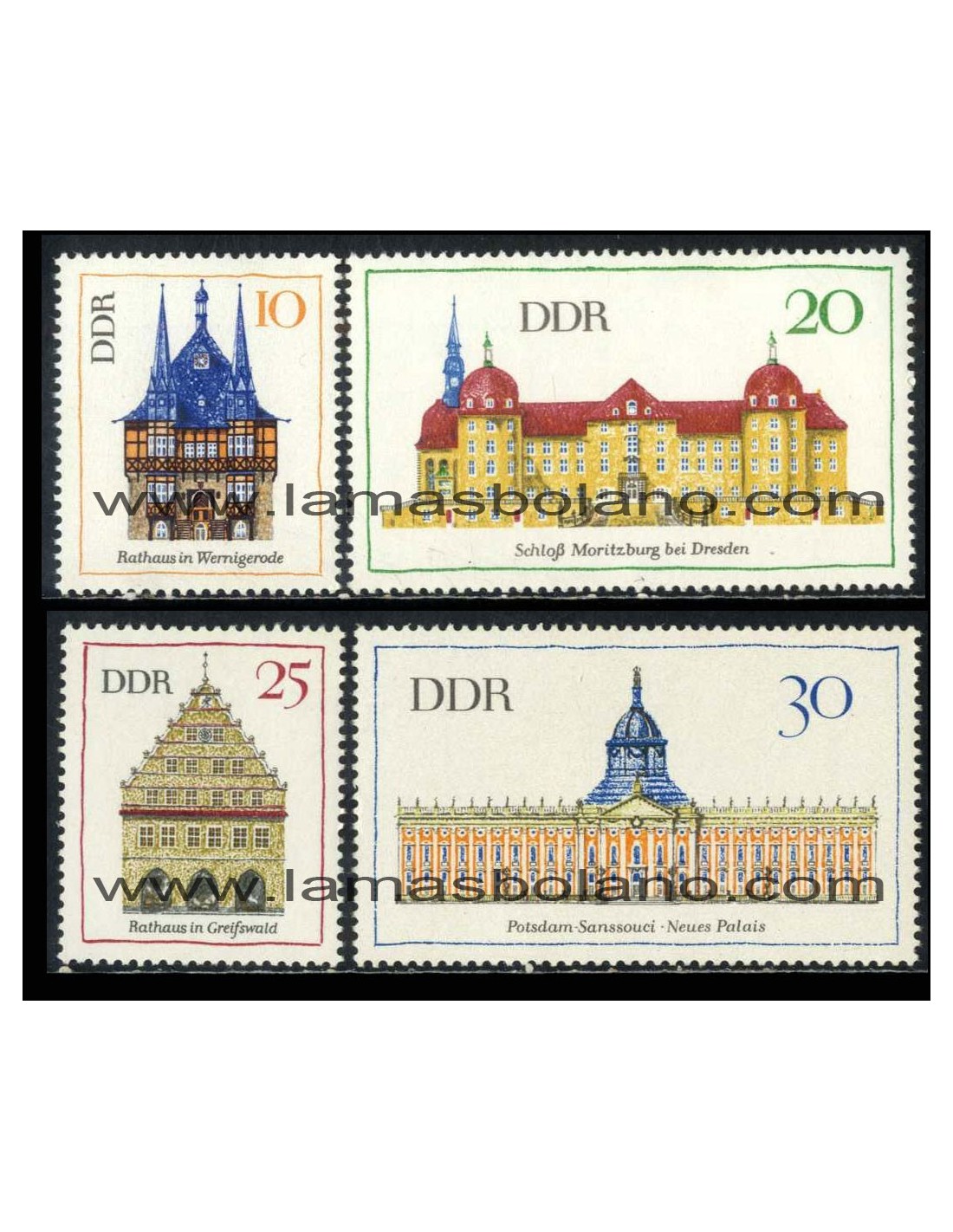 EDIFICIOS (Ayuntamiento de Wernigerode, Castillo de Moritzburg en Dresde, Ayuntamiento de Greifswald, Nuevo palacio Sans-Souci en Potsdam) - Dentado 13 1/2 x 14