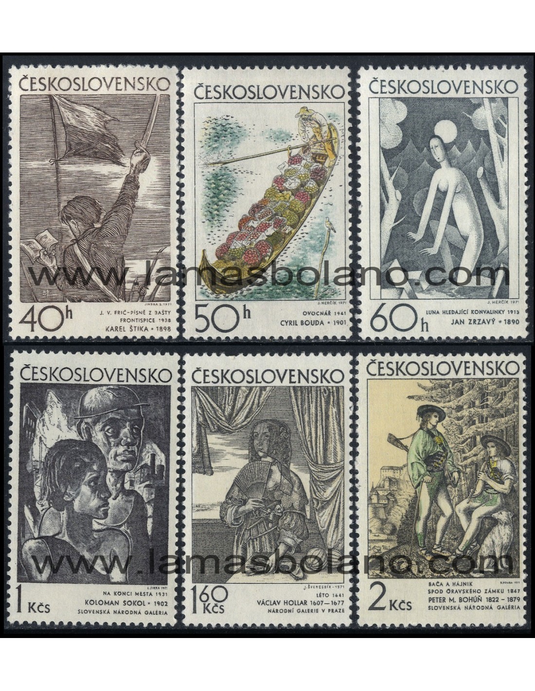 PINTURAS (Cantando en el bastión de K. Stika, Jardinero de C. Bouda, Búsqueda de muguet al claro de luna de J. Zrzavy, En el límite de la ciudad de K. Sokol, Verano 1641 de V. Hollar, Pastor y guarda de caza del castillo de Orava de P. Bohun) - Dentado 11 1/2