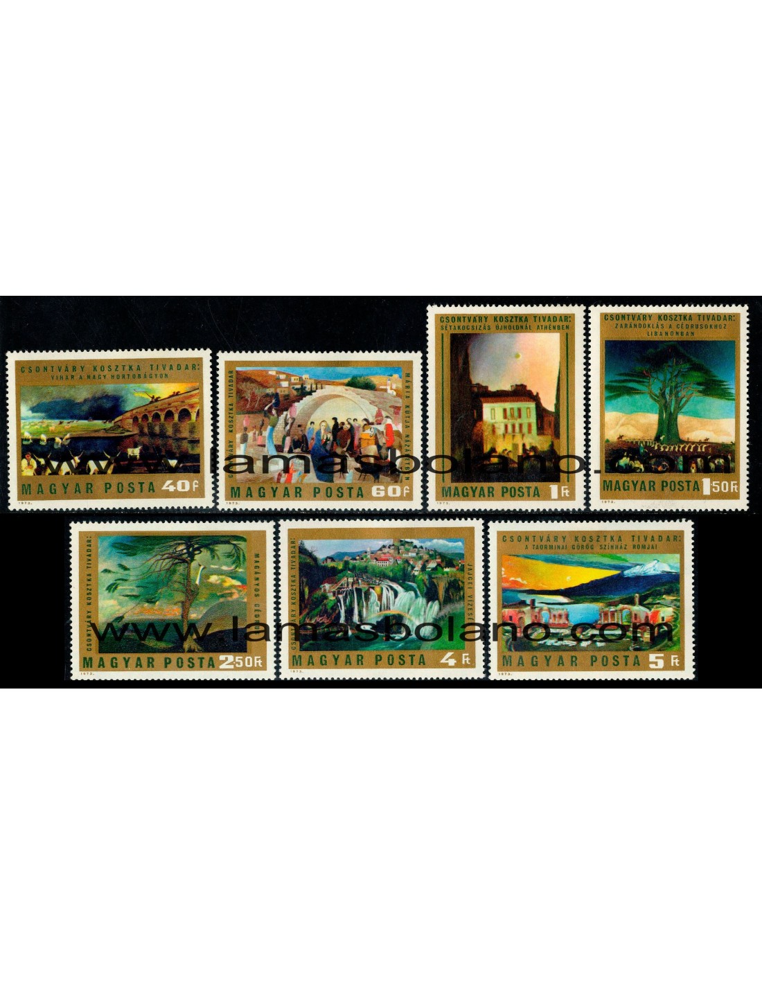PINTURAS DE TIVADAR CSONTVARY KOSZTKA (Tormenta sobre la Puszta de Hortobagy 1903, La fuente de María en Nazareth 1908, Paseo en coche al claro de luna en Atenas 1904, Peregrinaje a los cedros del Líbano 1907, El cedro solitario 1907, Cascada de agua en Jajce 1903, Ruínas del teatro griego en Taormina 1904-1905) - Dentado 12 1/2
