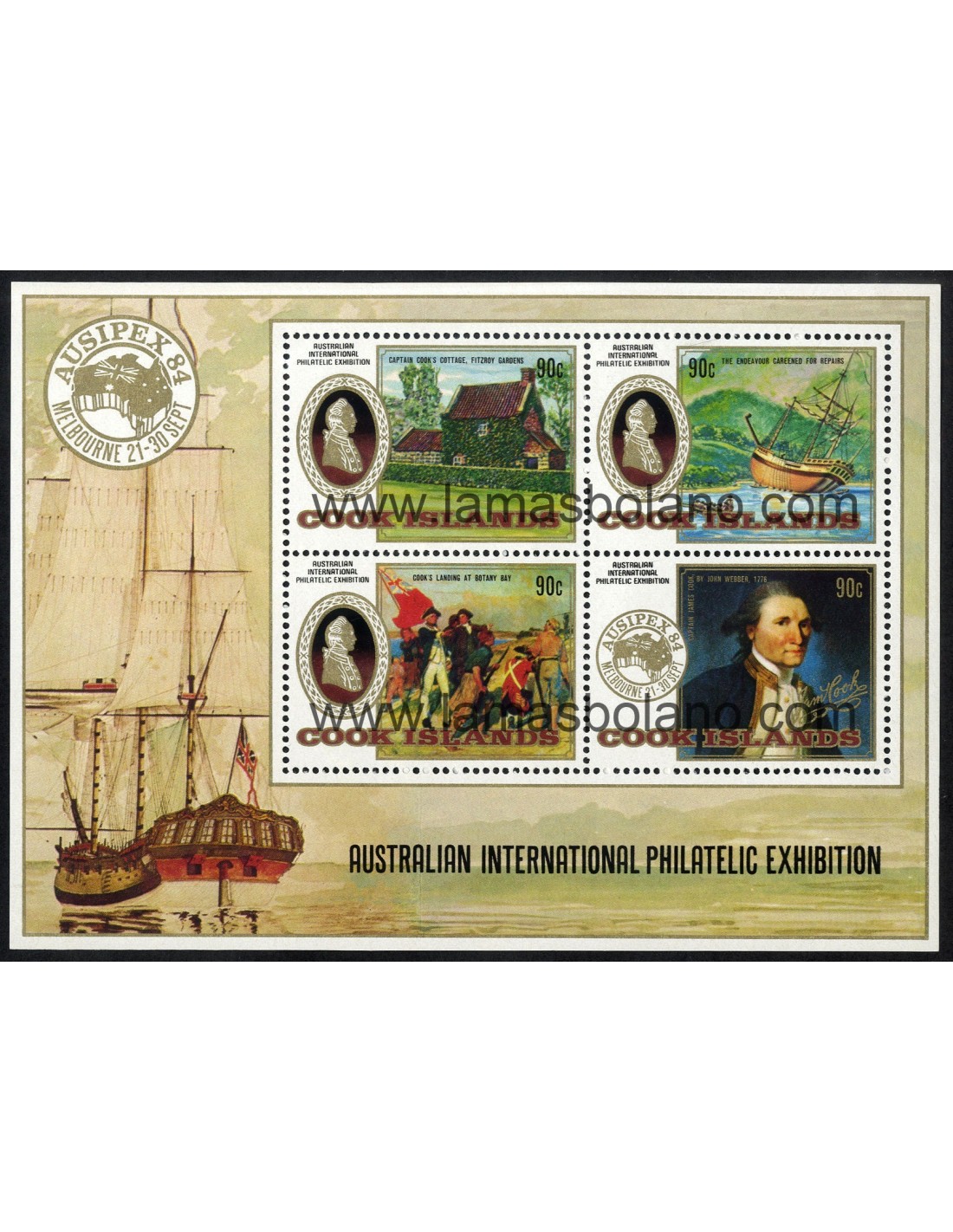AUSIPEX 84 EXPOSICION FILATELICA INTERNACIONAL EN MELBOURNE (La casa del Capitán James Cook en Great Ayton Yorkshire, El Endeavour, Primer desembarco del capitán James Cook en Botany Bay, Retrato del capitán Cook con su firma) - Formato 140 x 100
