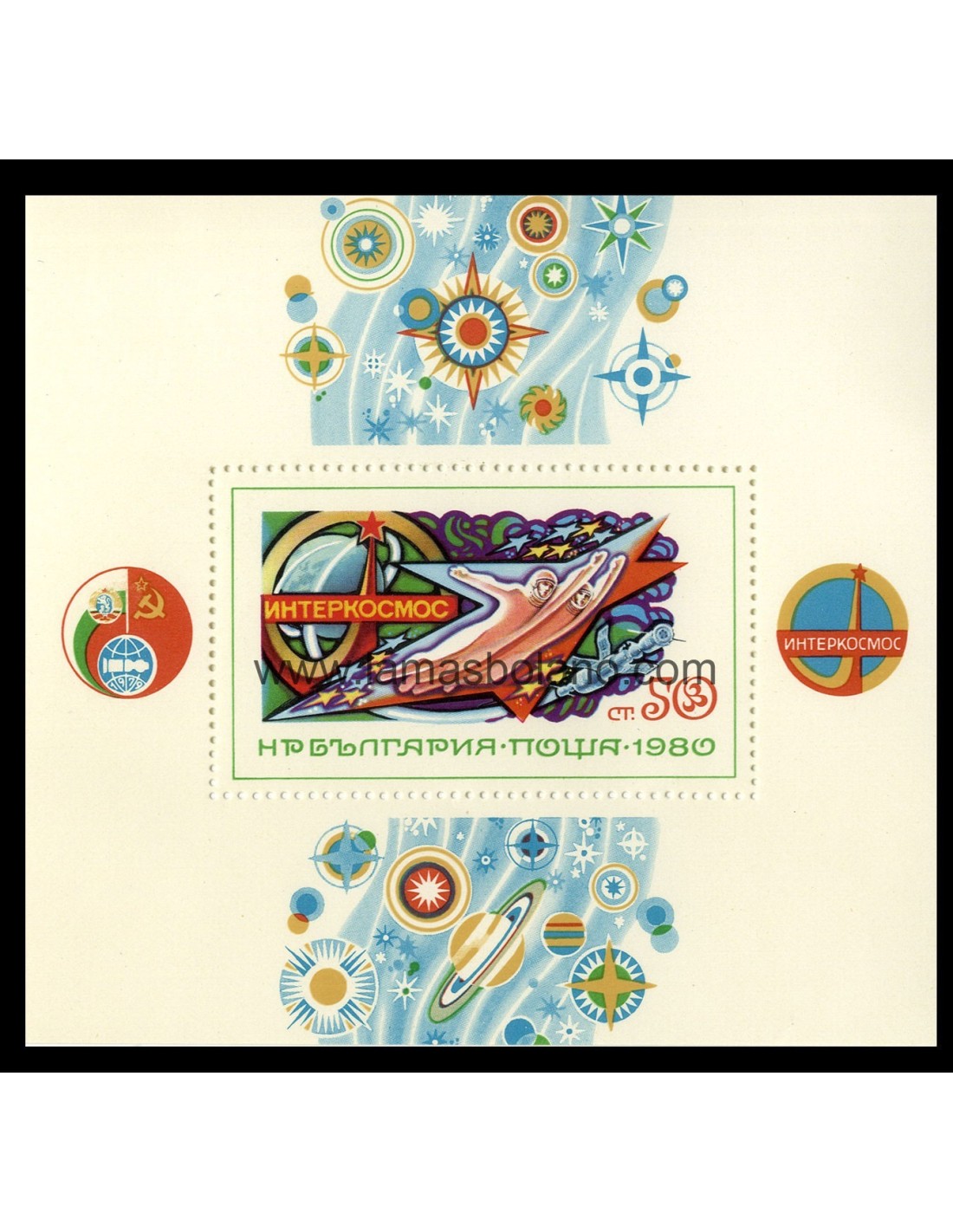 SELLOS DE BULGARIA 1980 - ANIVERSARIO DEL PRIMER HOMBRE BULGARO EN EL ESPACIO - PROGRAMA INTERCOSMOS - HOJITA BLOQUE