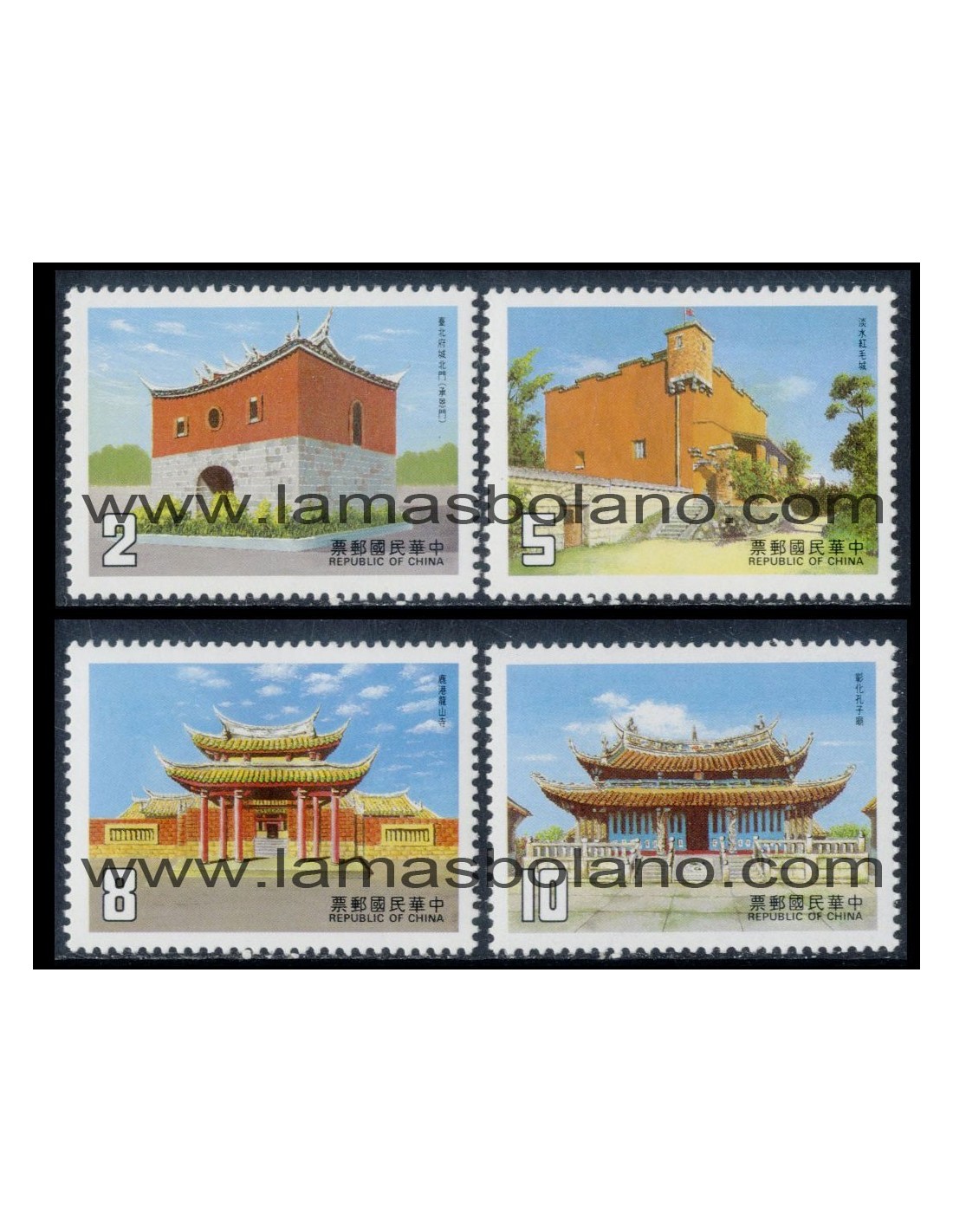 EDIFICIOS HISTORICOS (Puerta Norte de las viejas murallas Taipeh 1882, Fuerte San Domingo en Tamsui 1629, Templo Lung Shan en Lukang 1760, Templo de Confucius en Changhua 1726) - Dentado 13 1/2