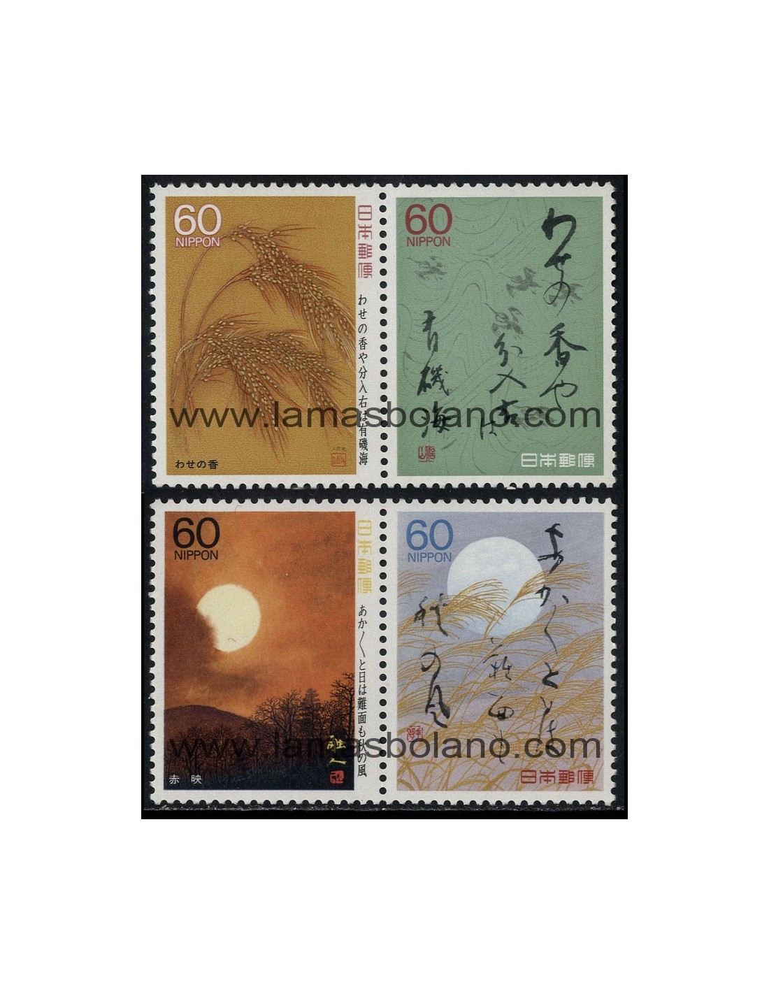 POEMAS DE VIAJE DE OKU-NO-HOMOSICHI (Espigas de arroz, Poemas sobre un fondo de montaña y pájaro, Claro de luna en un paisaje, Poema sobre un fondo de arrozal y claro de luna) - Dentado 13