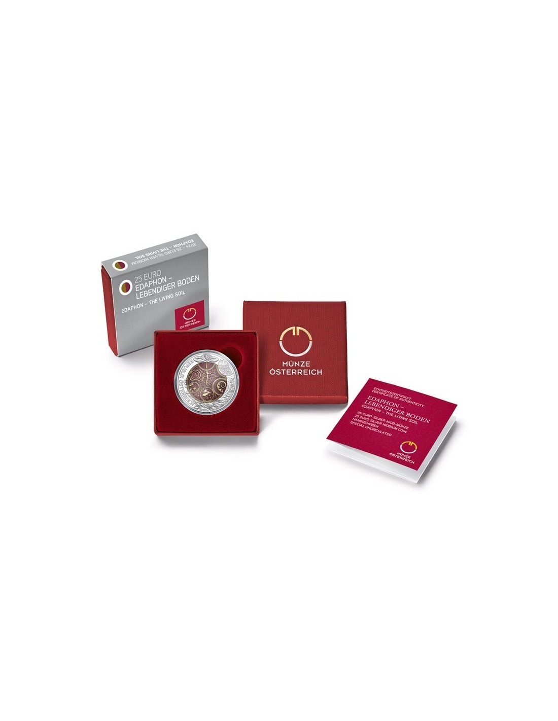 Esta nueva moneda perteneciente a la Serie 25 Euro Niobium acuñada por la Austrian Mint homenajea el vibrante y desconocido, para muchos , mundo del suelo. Es un mundo que forma la base de nuestra existencia y es la clave para el futuro de nuestro planeta. Bajo nuestros pies se oculta un ecosistema del que depende nuestra existencia pero del que apenas somos conscientes. Tan diverso como una selva tropical, el edafón, es un término colectivo que abarca todos los organismos vivos presentes en el suelo.
