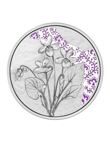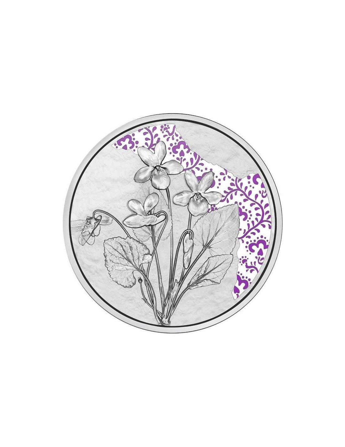 Esta moneda perteneciente a la Serie El lenguaje de las Flores acuñada por la Austrian Mint evoca a las Violetas. Esta planta cuyas hojas en forma de corazón y pequeñas flores moradas, florecen a finales del invierno y principios de la primavera. Es tal el magnetismo y connotaciones asociadas a esta flor que durante siglos han sido muy apreciadas por el ser humano. Se le asocia a la modestia, moderación, inocencia y firmeza; sin olvidar la fidelidad, lealtad y constancia. Como resultado la poetisa de la antigua Grecia Safo creó un monumento poético a la violeta, es por ello que la flor está vinculada con la diosa