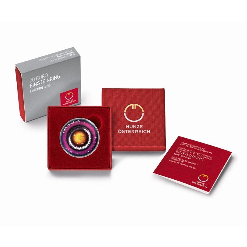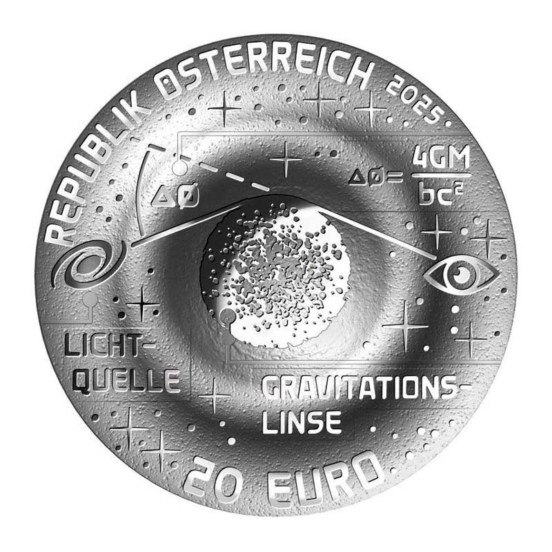 El diseño de esta moneda destaca por su borde ondulado y un Anverso convexo a color representando el famoso Anillo de Einstein junto a la leyenda "EINSTEINRING". El Reverso de la moneda muestra de nuevo el anillo como una onda circular. Entre la fuente de luz y el observador, se se encuentra un cúmulo de galaxias que desvía la luz por la gravedad. La fórmula ∆∅=4GM/bc², que permite calcular la desviación de la luz, completa el diseño de esta extraordinaria moneda. Moneda de 20 euro en Plata Proof con una tirada de 30.000 unidades acompañada de su correspondiente estuche y certificado oficial.