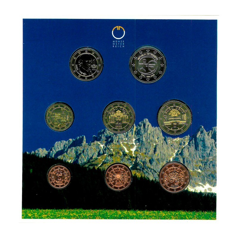 El Reverso de las monedas es común a todos los países, mientras que el Anverso de las monedas muestra: Bertha Von Suttner (2 Euro), Wolfang Amadeus Mozart (1 Euro), Secesión de Viena (50 Cent), Iglesia Belvedere (20 Cent), Wiener Stephansdom (10 Cent), Alpenprimel (5 Cent), Edelweiss (2 Cent), Enzian (1 Cent). Rodean las monedas las doce estrellas.