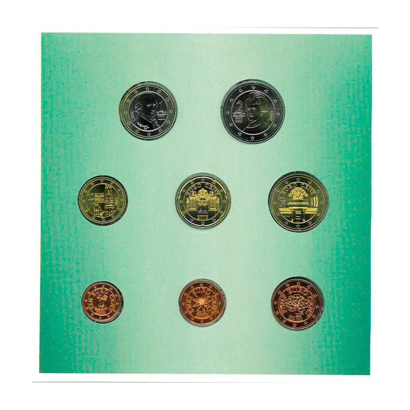 El Reverso de las monedas es común a todos los países, mientras que el Anverso de las monedas muestra: Bertha Von Suttner (2 Euro), Wolfang Amadeus Mozart (1 Euro), Secesión de Viena (50 Cent), Iglesia Belvedere (20 Cent), Wiener Stephansdom (10 Cent), Alpenprimel (5 Cent), Edelweiss (2 Cent), Enzian (1 Cent). Rodean las monedas las doce estrellas.