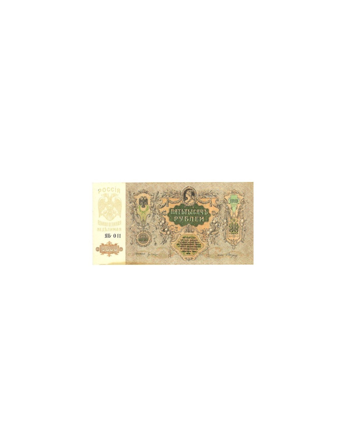 5000 Rublos en color marrón, naranja y verde. Sin Circular. El Anverso muestra la imagen del doble águila a la izquierda y la efigie de Mercurio en la parte superior. El Reverso muestra una ilustración de Saint George con el escudo y la bandera aplastando una serpiente.