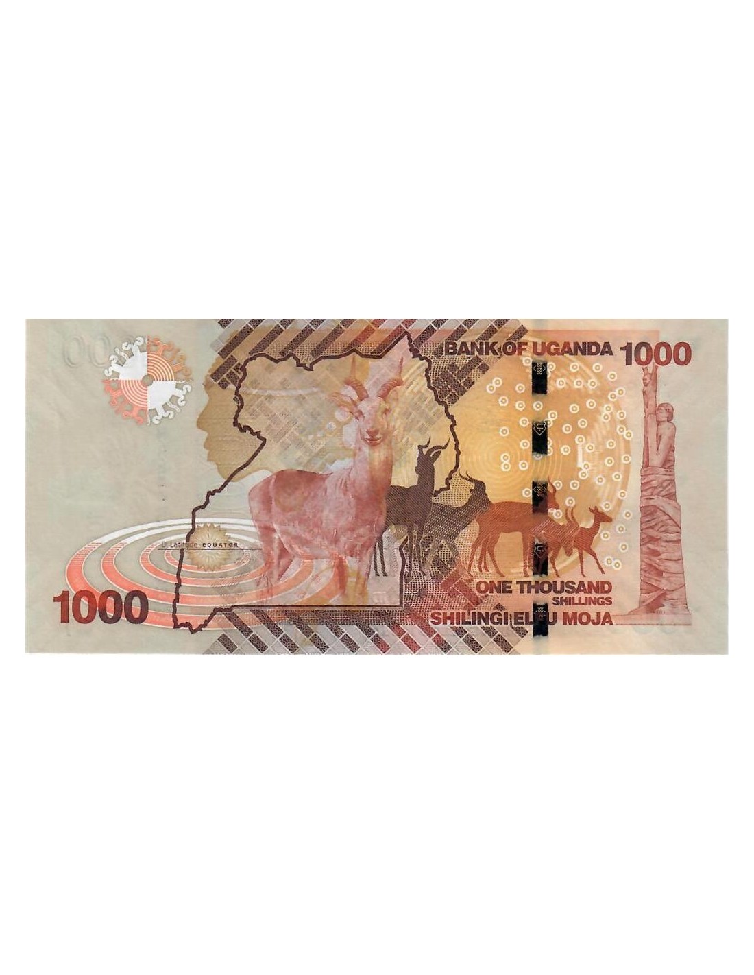 1000 Chelines en color marrón y naranja. Sin Circular. El Anverso muestra un paisaje de Uganda y debajo el texto "shilingi elfu moja". El Reverso muestra la imagen de varios "kob" (antílope de Uganda) animal nacional y detrás el mapa del país. Número de Catálogo World Paper Money 49.