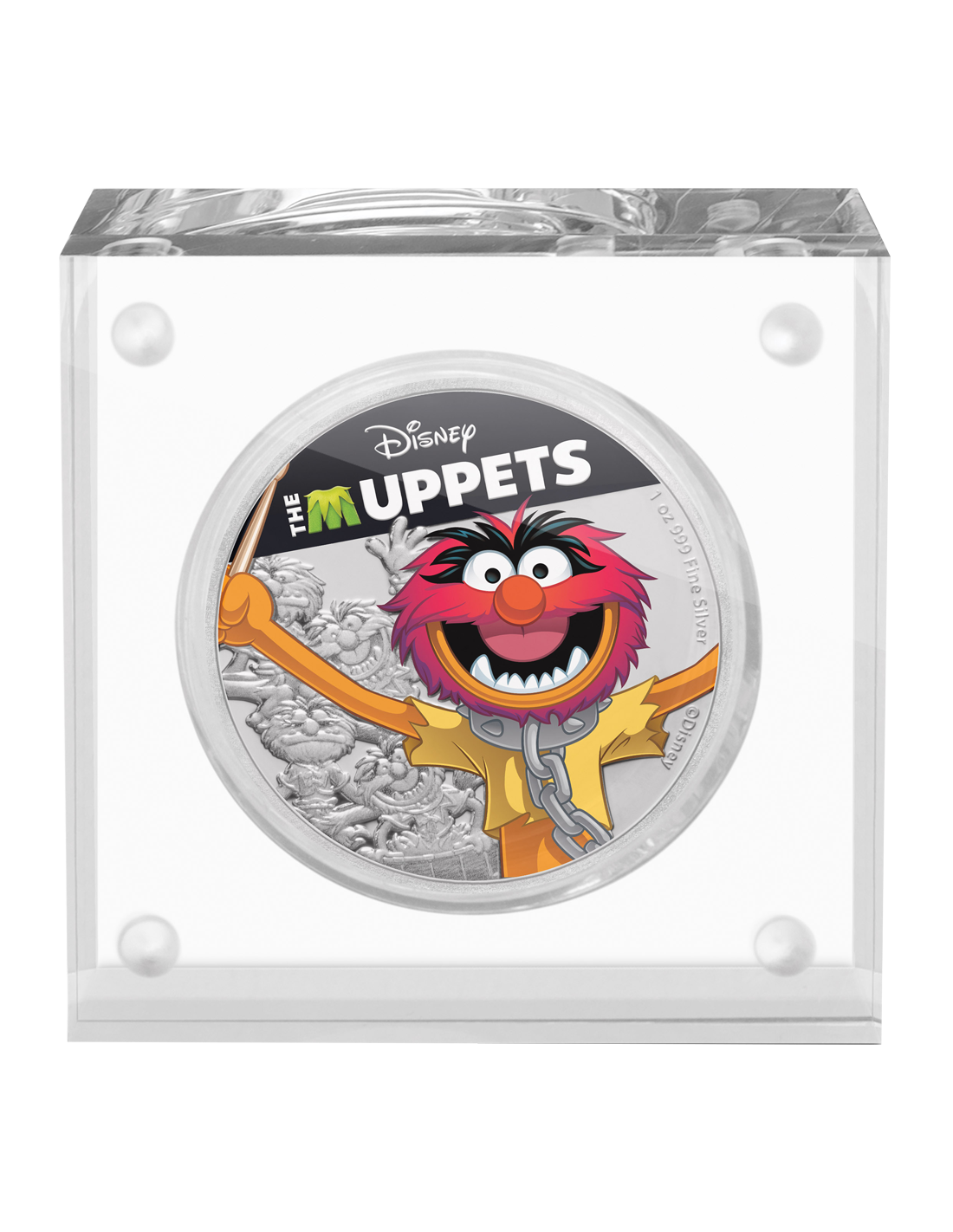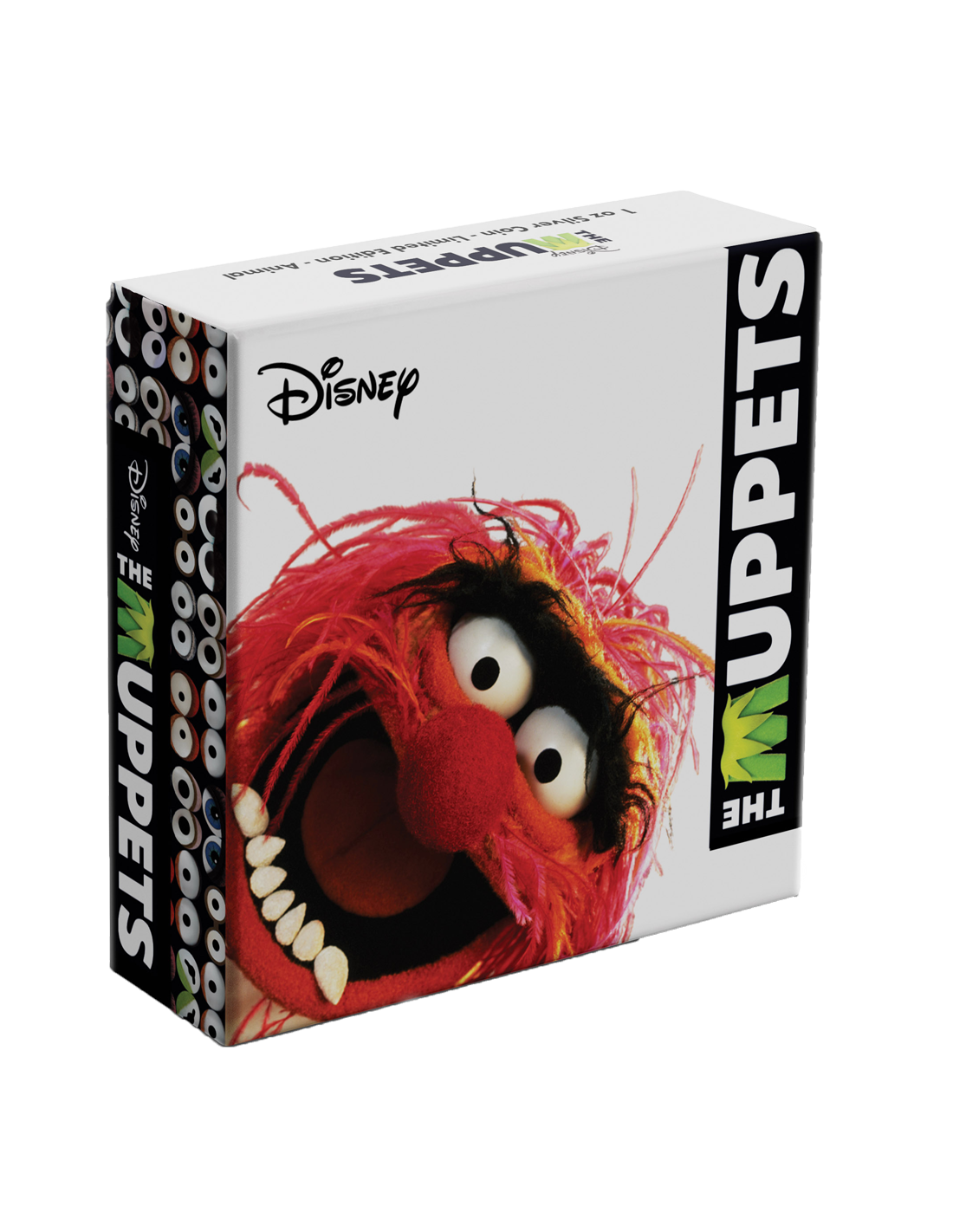 Animal es la cuarta y última moneda de la serie de monedas Disney ™ - The Muppets ™. The Muppet Show se produjo entre 1976 y 1981 y tuvo tanto éxito que se transmitió en más de 100 países. Animal ™ es el baterista loco y peludo que está atado a sus tambores con una cadena. Además de los gruñidos, se comunica principalmente a través de sus tambores. La moneda fue acuñada con 1 onza de plata al 99,9% por la Casa de la Moneda de Nueva Zelanda y muestra las muchas caras locas de Animal ™ en color. El diseño de la moneda se completa con el nuevo logo de The Muppets ™. La moneda de plata Animal ™ tiene licencia oficial de Disney ™.