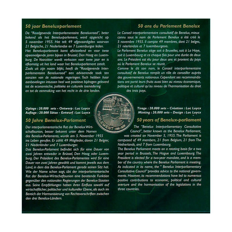 Las Casas de la Moneda de Bélgica, Holanda y Luxemburgo presentan las nuevas Carteras de Euro correspondientes al año 2005, compuesta por 8 monedas (2 y 1 Euro, 50, 20, 10, 5, 2, 1 Céntimos) como viene siendo habitual, más una medalla con una imagen dedicada al 50º Aniversario del Parlamento de Benelux.