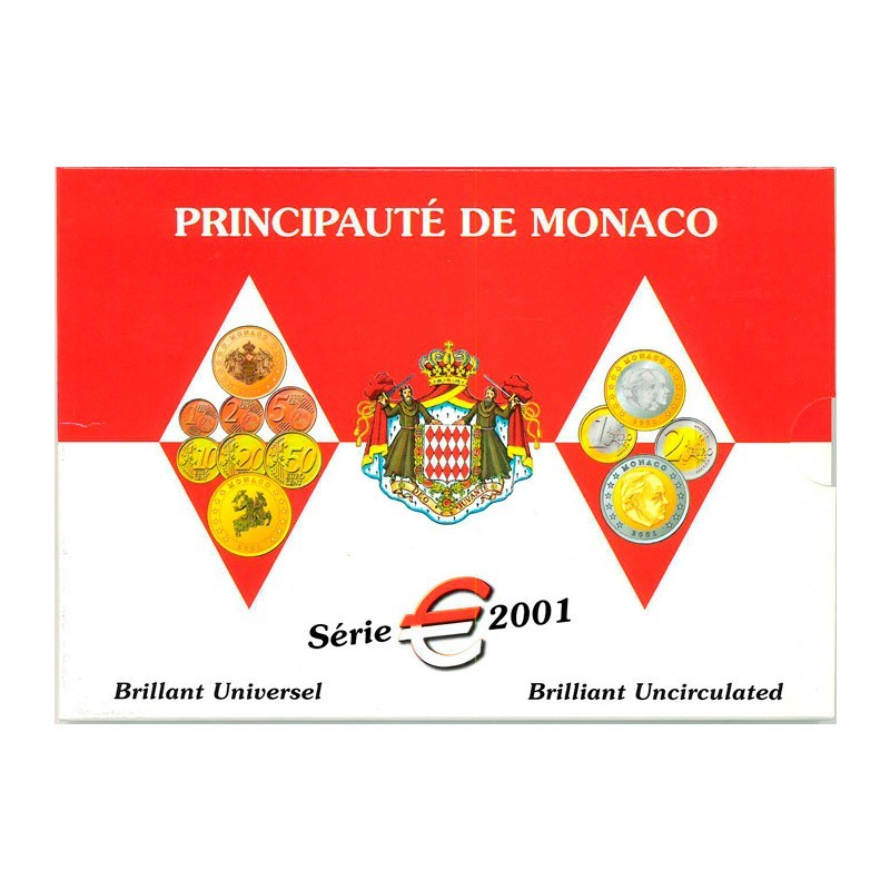 La Monnaie de Paris presenta la nueva Cartera de Euro correspondiente al año 2001, compuesta por 8 monedas (2 y 1 Euro, 50, 20, 10, 5, 2, 1 Céntimos) como viene siendo habitual. El Anverso de las monedas de 1, 2 y 5 céntimos muestra el Escudo de armas de los Grimaldi, las monedas de 10, 20 y 50 céntimos muestra el sello histórico de S.A.S. el Príncipe Rainiero III utilizado como motivo monetario desde 1950, la moneda de 1 Euro muestra la doble efigie del Príncipe Soberano y el Príncipe Heredero, y la moneda de 2 Euro muestra la efigie del Príncipe Rainiero III. El Reverso de las monedas es común a todos los países. Rodea las monedas las doce estrellas. Carterita Euro Oficial con una tirada de 8.000 unidades y un valor facial de 3.88 Euro.