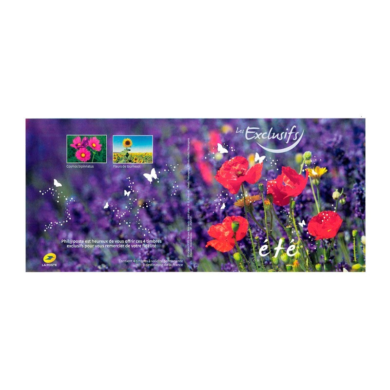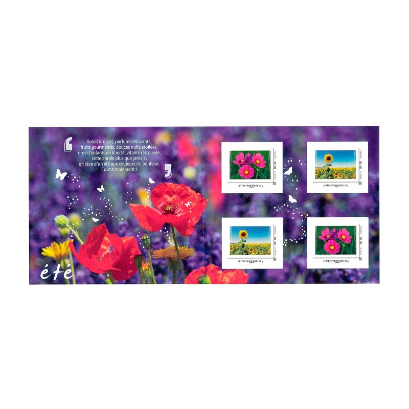 Serie Estaciones. Cosmos bipinnatus y flores de girasol. Carnet con 4 sellos autoadhesivos.