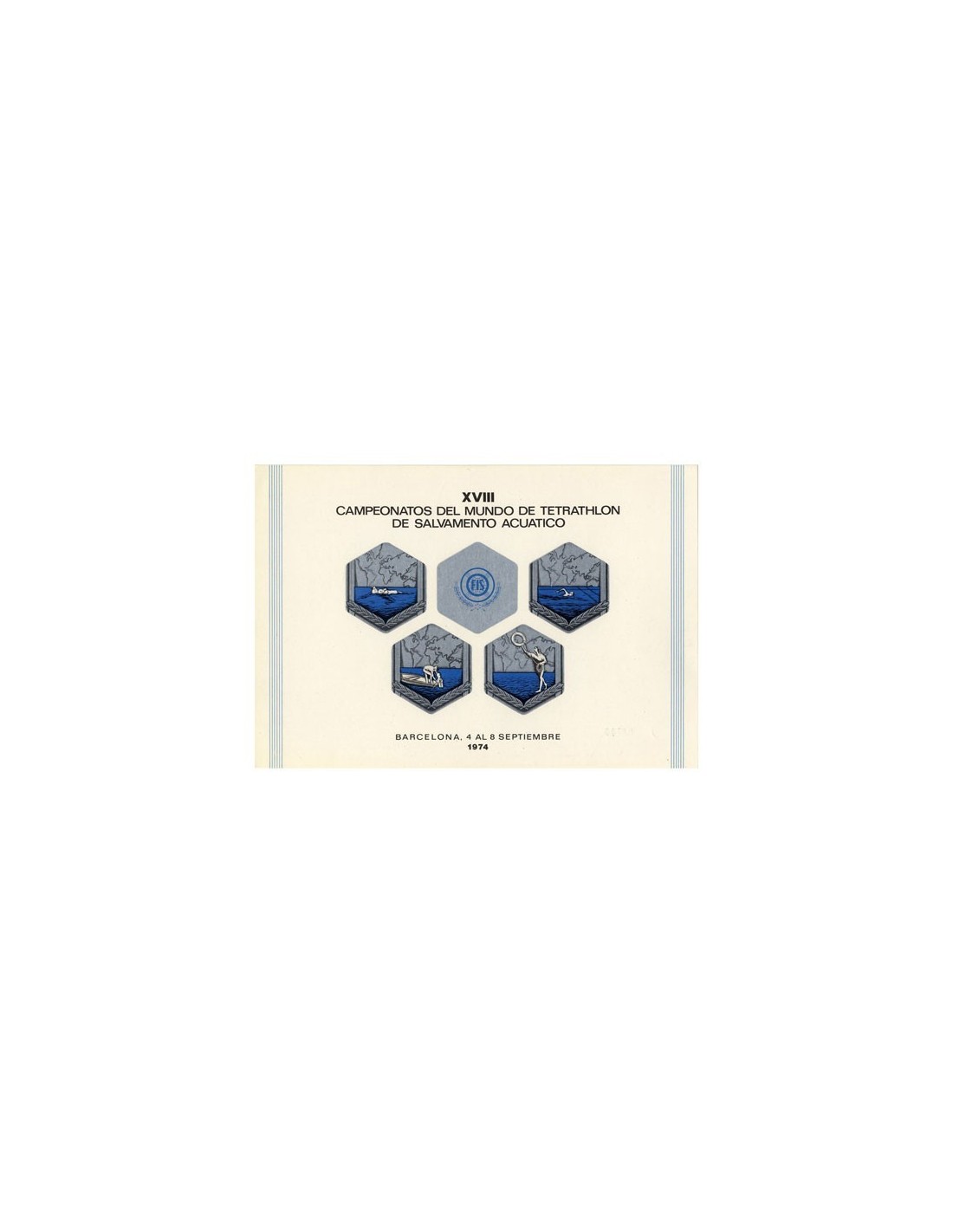 Tarjeta conmemorando los XVIII Campeonatos del mundo de Tetrathlon de salvamento acuático celebrados en Barcelona del 4 al 8 de Septiembre de 1974.