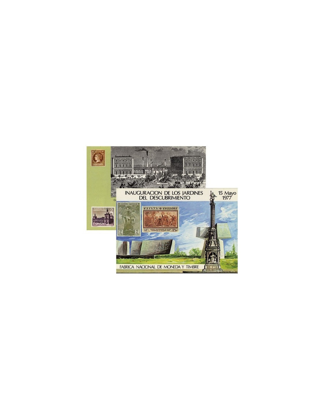 Inaugurados el 15 de mayo de 1977. Ilustración de los jardines e imagen de la Casa de la Moneda en la Plaza de Colón inaugurada el 13 de febrero de 1861. Ambas imágenes van acompañadas de reproducciones de varios sellos.