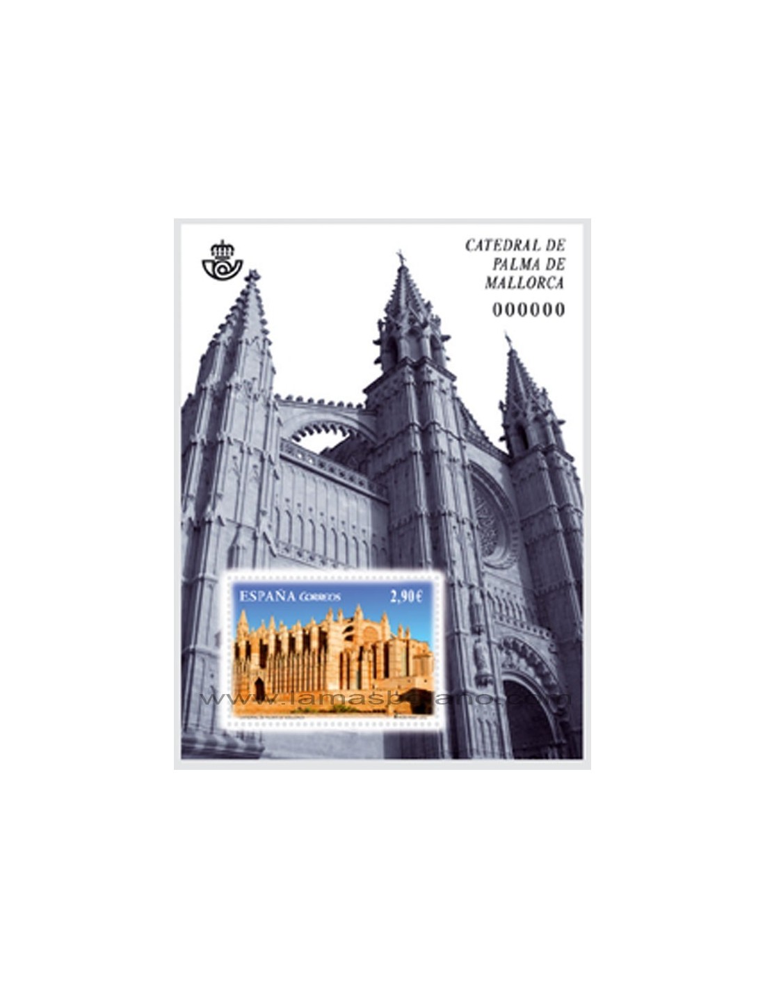 En la hoja bloque se reproduce una parte de la fachada principal, con las torres y arbotantes, y en el sello una vista general del templo tomada desde la cabecera.