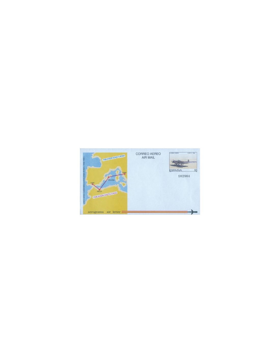 Fecha emisión: 7 octubre 1989 - Aerograma. Líneas postales. Línea Cádiz-Melilla-Pollensa-Roma. Hidroavión y mapa.