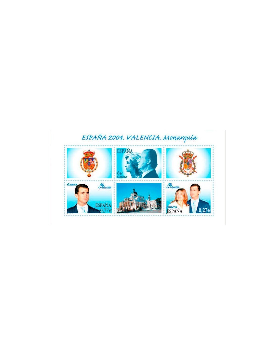 La ceremonia de compromiso se celebró el 6 de Noviembre de 2003; y el enlace tuvo lugar en la Catedral de la Almudena de Madrid el 22 de Mayo de 2004 ante más de 1.200 invitados. Asistieron representantes de 12 Casas Reales reinantes y otras 12 Casas Reales no reinantes. La boda fue oficial por Antonio María Rouco Varela, arzobispo de Madrid. En el sello aparecen diferentes imágenes: efigies superpuestas de los Reyes Don Juan Carlos I y Doña Sofía, el Príncipe Felipe y Letizia Ortiz, acompañados de 2 viñetas de los escudos reales y el Palacio Real de la Almudena de Madrid. En la parte superior aparece la leyenda ESPAÑA 2004. VALENCIA. MONARQUÍA