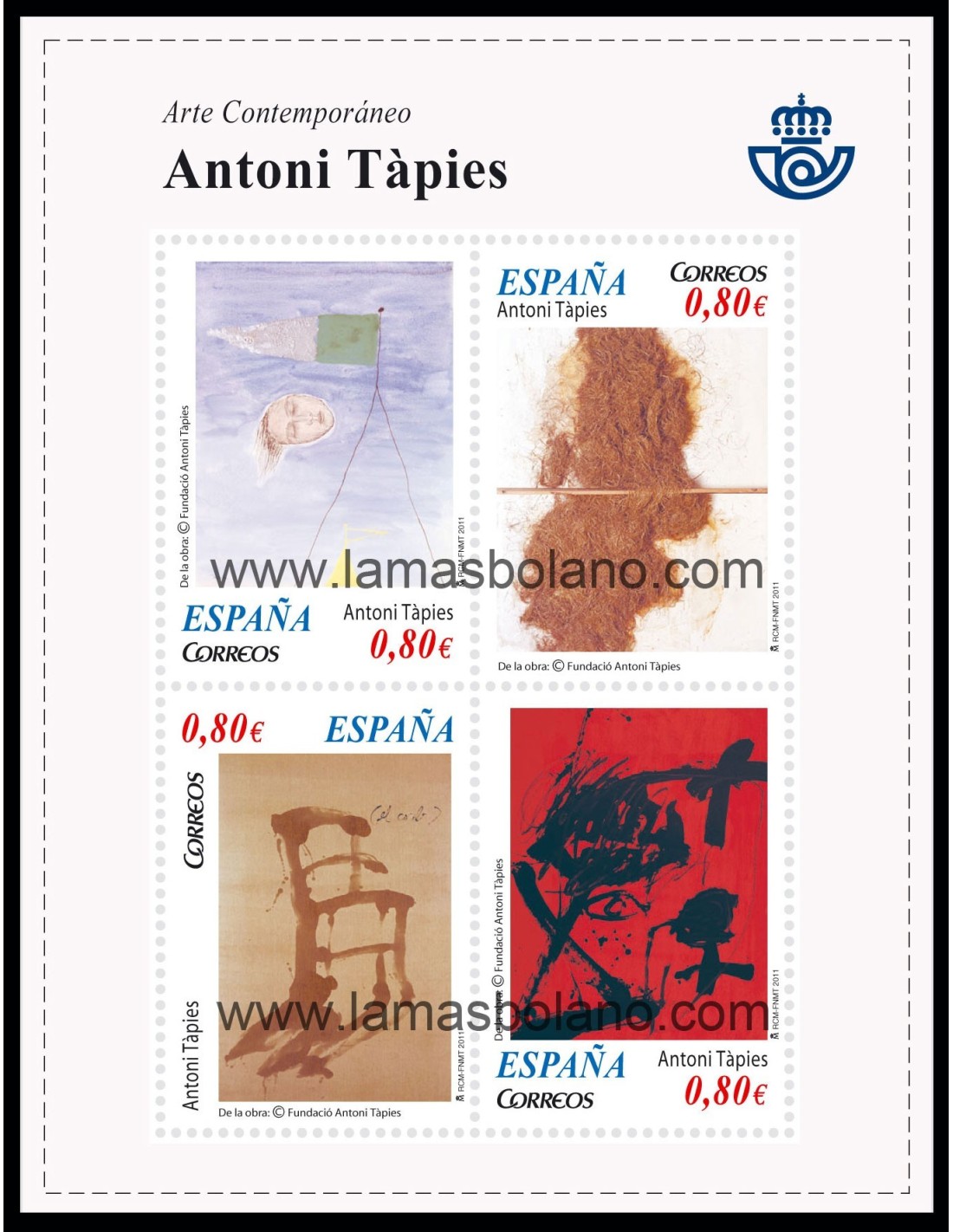 La hoja bloque de Arte Contemporáneo se ilustra con cuatro sellos representativos de las distintas etapas del artista, Antoni Tàpies.