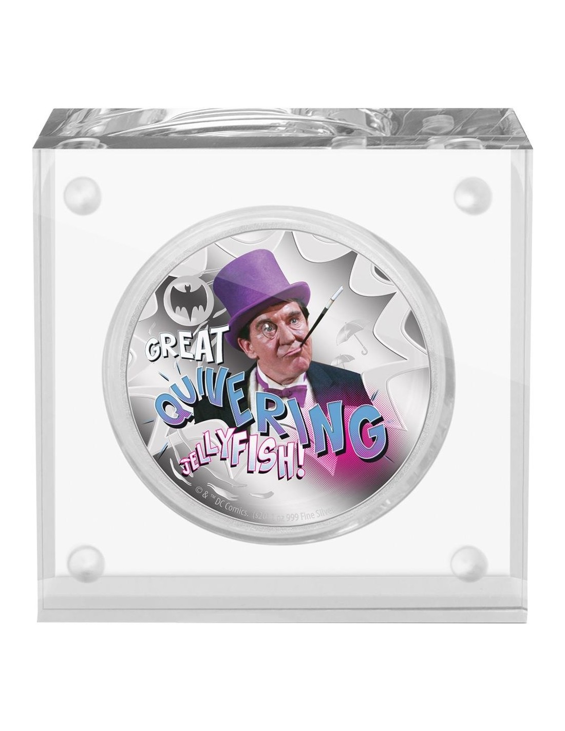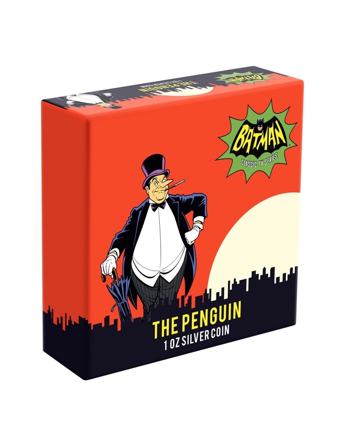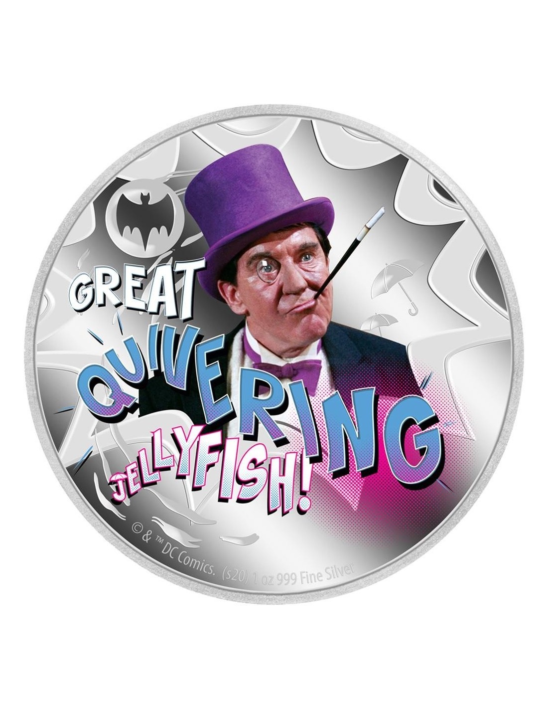 Bajo el nombre de "Oswald Cobblepot™, fue apodado "pingüino" debido a su andar, su altura y su nariz aguileña. Bajo este mote y con su inseparable paraguas, se hizo un nombre en el inframundo de Gotham™ como criminal. El Anverso de la moneda muestra a el Pingüino con su habitual vestimenta televisiva y su mítica frase "Great Quivering Jellyfish". El Reverso de la moneda muestra la efigie de Su Majestad la Isabel II, el valor facial y año de acuñación.