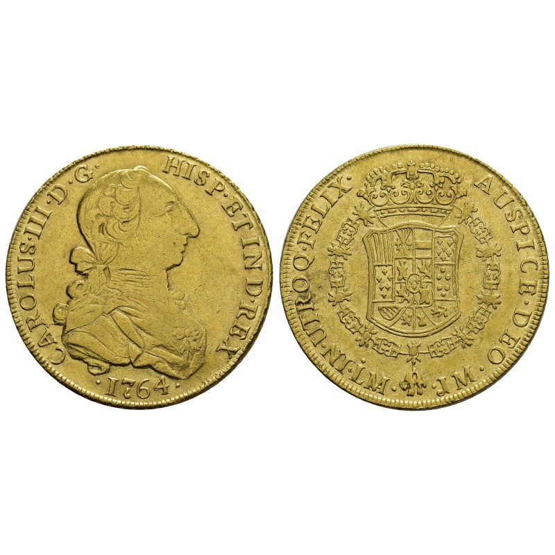 8 Escudos 1764 Lima JM Carlos III. Primer tipo del busto llamado "cara de rata". Bonito color. Conservación: EBC