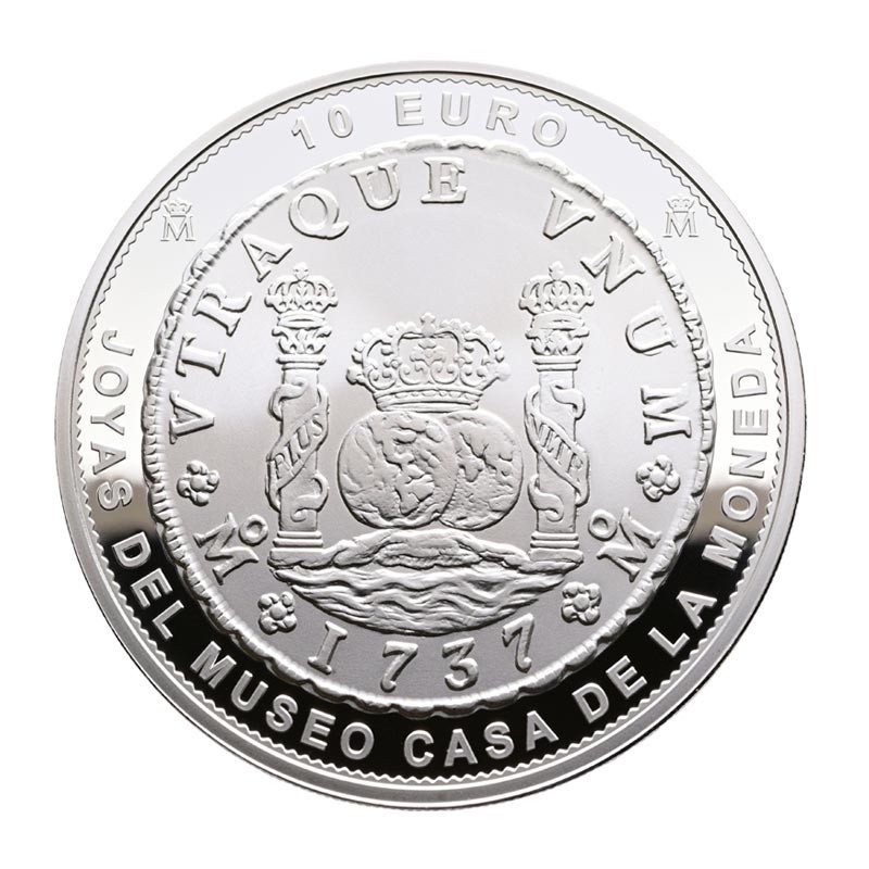 El Reverso muestra la imagen del reverso de la moneda de 8 reales acuñada en México en 1737 bajo el reinado de Felipe V con sus características "Columnas de Hércules" sobre unas olas. En sentido circular y en mayúsculas el valor facial 10 EURO flanqueado por la marca de la Ceca y; la leyenda "JOYAS DEL MUSEO CASA DE LA MONEDA". El Anverso de la moneda muestra la imagen del Escudo Real cuartelado de Castilla y León de Felipe V. En sentido circular y en mayúsculas las leyendas "ESPAÑA 2025" y "8 REALES 1737 MÉXICO".