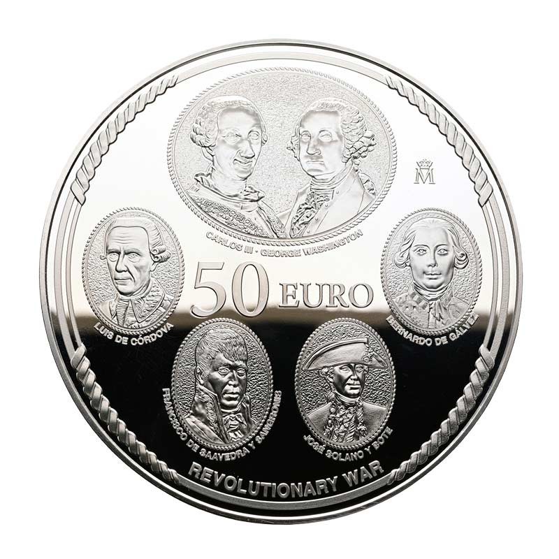 El anverso de la moneda muestra la imagen a color de "las trece salvas" de los cañones españoles. En la parte superior, en sentido circular y en mayúsculas las leyendas "250 ANIVERSARIO DECLARACIÖN DE INDEPENDENCIA DE LOS EE.UU. - 1776." y trece estrellas representativas de las colonias que declararon la independencia de Gran Bretaña. El reverso de la moneda muestra en la zona central el valor facial 50 EURO, rodeada por los retratos del Rey de España Carlos III, George Washington , Luis de Córdova, Francisco de Saavedra y Sangronis, José Solano y Bote y Bernardo de Gálvez. En la base de cada marco figuran. En sentido circular y en mayúsculas la leyenda "REVOLUTIONARY WAR". Las composiciones de la moneda vienen enmarcadas por una compostura en forma de orla.