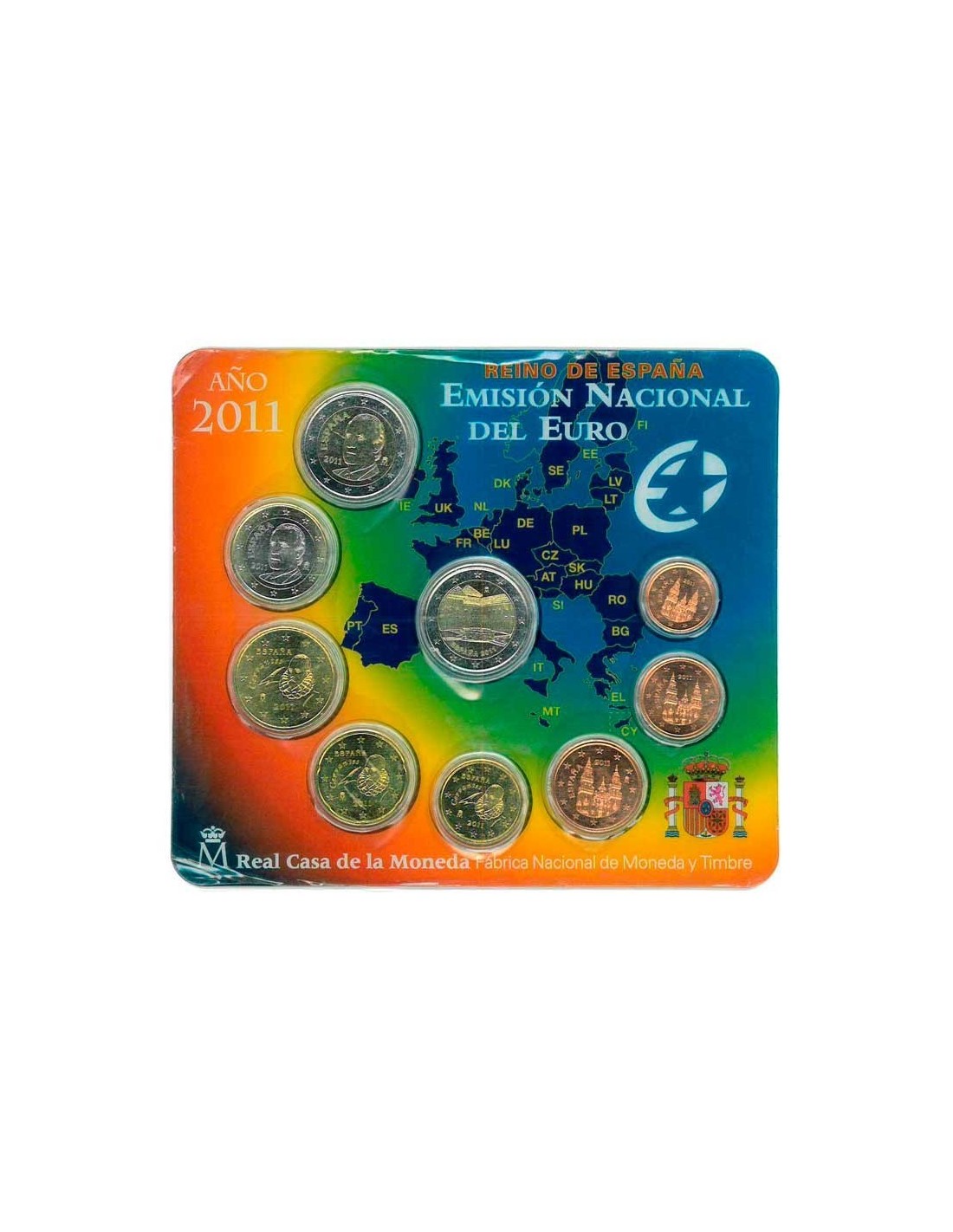 Emisión anual emitida por la Fábrica Nacional de Moneda y Timbre incluyendo las monedas de Euro circulantes del año 2011, acuñadas de manera artesanal, con cospeles y troqueles especialmente tratados para obtener la máxima calidad. Las monedas de 1, 2 y 5 céntimos reproducen en el anverso la fachada de la Catedral de Santiago de Compostela, el reverso es el común a todos los países de la Zona Euro. Las monedas de 10, 20 y 50 céntimos en el anverso muestran el busto de Miguel de Cervantes, el reverso es el común a todos los países de la Zona Euro. Las monedas de 1 y 2 euros muestran en el anverso la efigie de S. M. el Rey de España, el reverso es el común a todos los países de la Zona Euro. Incluye la moneda de 2 Euro conmemorativa dedicada a la Alhambra de Granada. Cartera del Euro con acabado BU y tirada de 25.000 unidades.