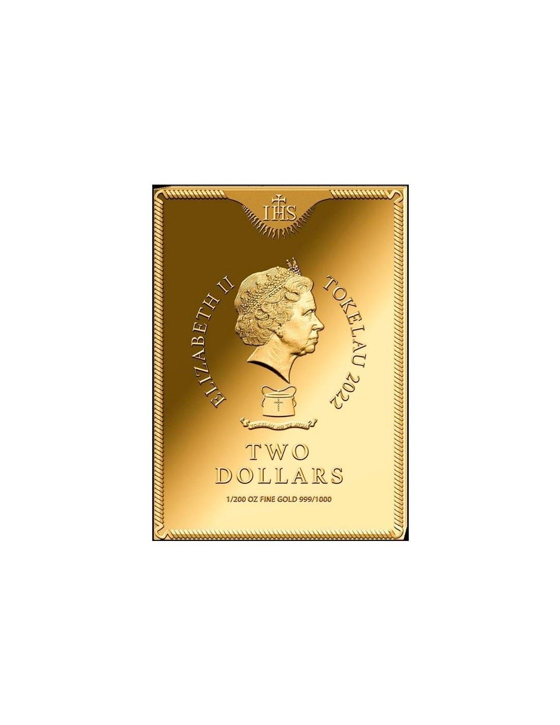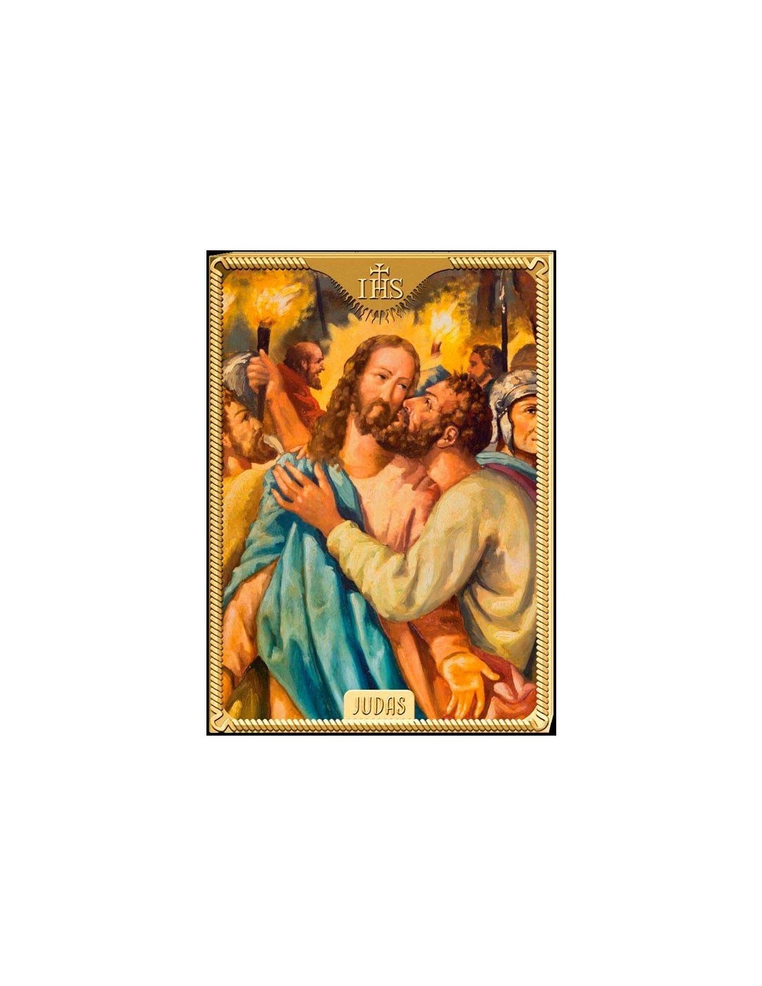 Judas fue uno de los doce discípulos de Jesús . Según cuentan los evangelios Judas traicionó a Jesús de Nazaret por treinta monedas de plata. Esta moneda en forma de lingote de 1/200 Onza en Oro 999% y acompañada de su correspondiente certificado de autenticidad muestra en el Anverso una imagen de Judas abrazando a Jesús rodeado de soldados romanos y fieles. En la parte inferior se aprecia la leyenda "JUDAS". Moneda 1/200 Onza en Oro 999/1000% acompañado de su correspondiente certificado de autenticidad.