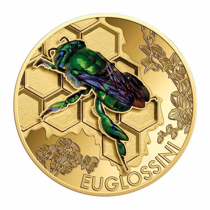 Moneda dedicada a la Abeja Euglossini. Las abejas forman parte de la diversidad de las especies y son las responsables de la reproducción de mucha flora. Están consideraras como un elemento esencial en nuestro ecosistema. Estas encarnan riqueza y prosperidad de todo ser viviente. Ideal para regalar. Moneda 1/1000 Onza en oro 999%. Presentación en cápsula quadrum.