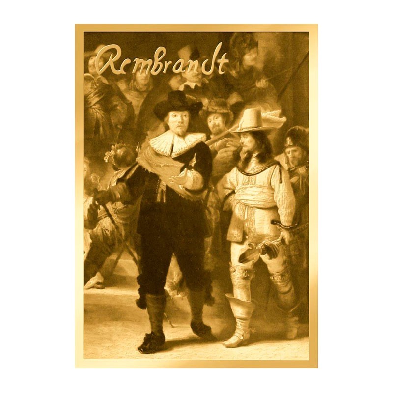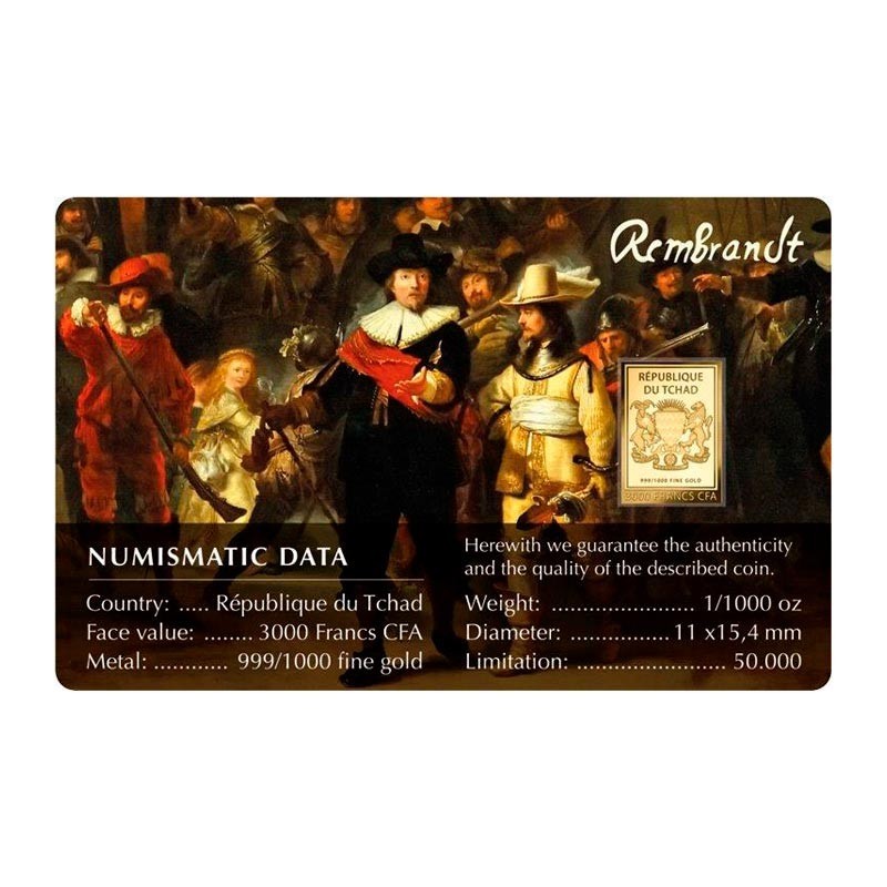Esta moneda rinde homenaje a la obra titulada "La Ronda de Noche" (1639 -1642) del artista neerlandés Rembrandt. Considerada como una de las obras más importantes de la historia del arte se encuentra expuesto al público en el Rijksmuseum de Ámsterdam. El autor está considerado como uno de los maestros del Barroco. Este cuadro, una de las obras pictóricas más representativas del pintor por su aportación al estilo Barroco, muestra la milicia del Capitán Frans Banninck Cocp . La fascinación por esta obra de arte ha trascendido generaciones y ahora inspira una extraordinaria moneda de 1/1000 Onza en Oro 999% presentada en un elegante blíster cuyo conjunto combina el arte y el valor numismático de forma exquisita. Moneda 1/1000 Onza en Oro 999% presentada en un coincard que actúa como certificado de autenticidad.