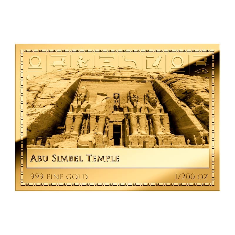 Esta moneda está dedicada a uno de los monumentos egipcios por antonomasia: los Templos de Abu Simbel. Construidos durante la época del Faraón Ramsés II alrededor de 1300 a. C están ubicados en la región de Nubia al sur de Egipto. El templo más grande está dedicado al Faraón y el de menor tamaño a su esposa la Reina Nefertiti. Estos fueron trasladados de su emplazamiento original de 1963 a 1968 para protegerlos del nivel del agua tras la construcción de una presa. Moneda de 1/200 Onza en Oro 999% presentada en estuche de metraquilato junto a su certificado de autenticidad.