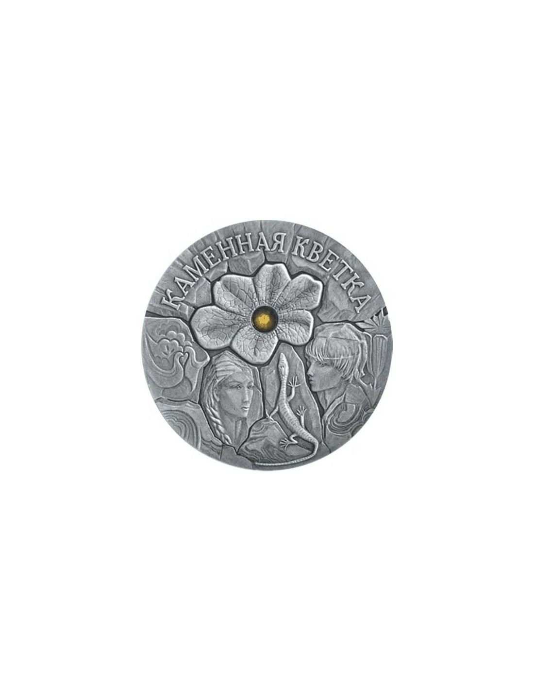 Moneda dedicada a la fábula "Flor de Piedra" en acabado plata antigua con una piedra de cristal acuñada por la Poland Mint.