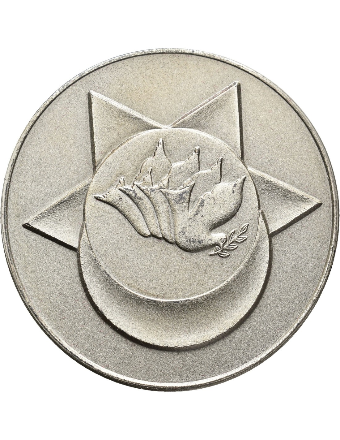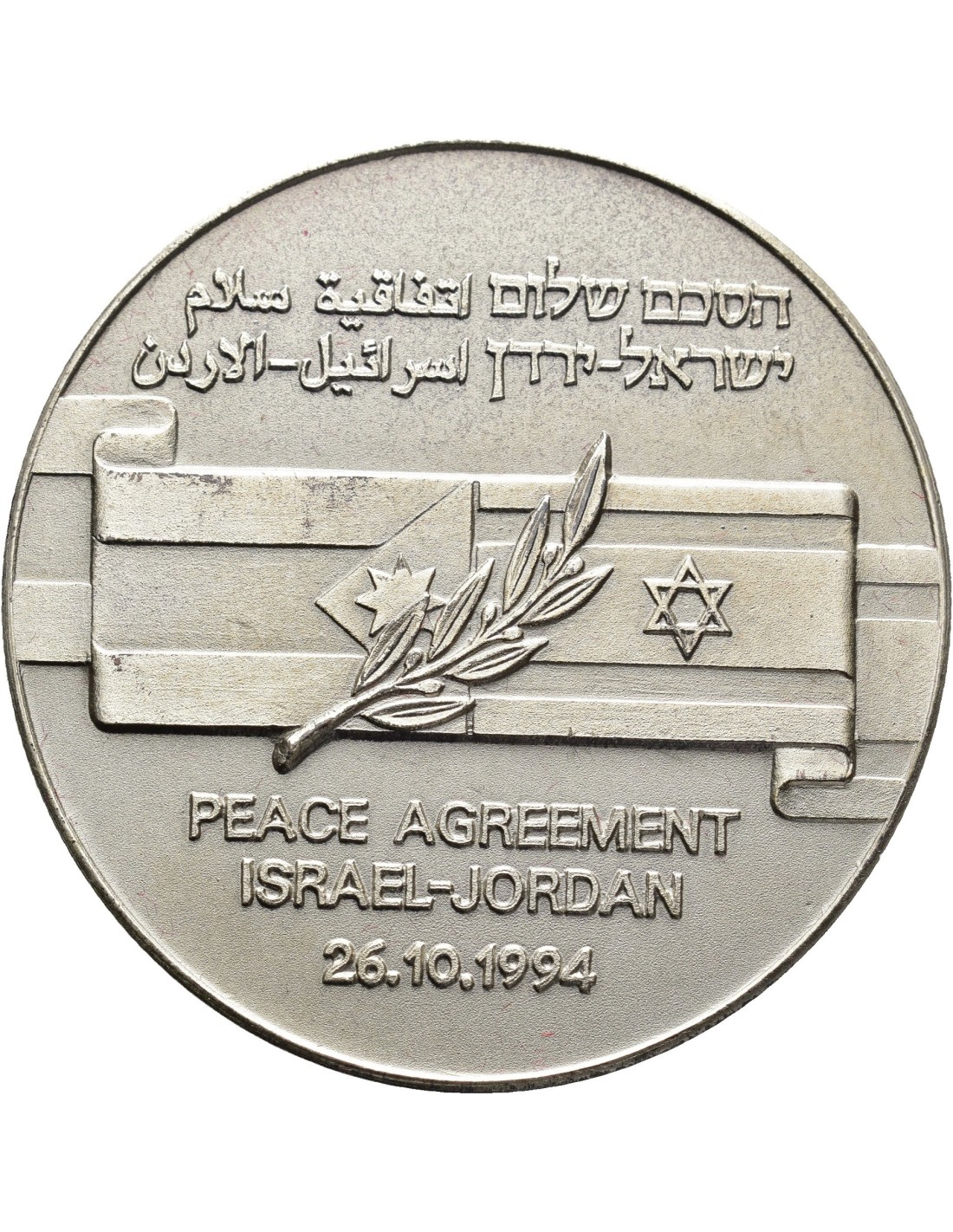 Medalla en cuyo Anverso se muestra una hilera de palomas de la paz dentro del símbolo de la bandera de Israel. El Reverso de la moneda muestra en la parte central las banderas de Jordania e Israel unidas por una espiga. En la parte inferior la leyenda PEACE AGREEMENT ISRAEL-JORDAN y la fecha 26.10.1994. En la parte superior la leyenda escrita en hebreo.