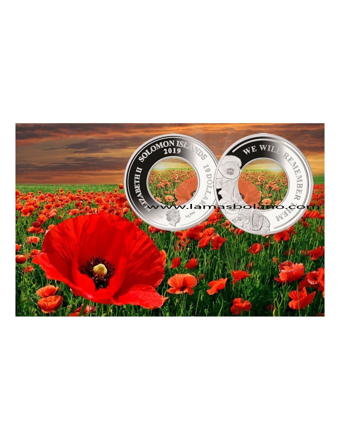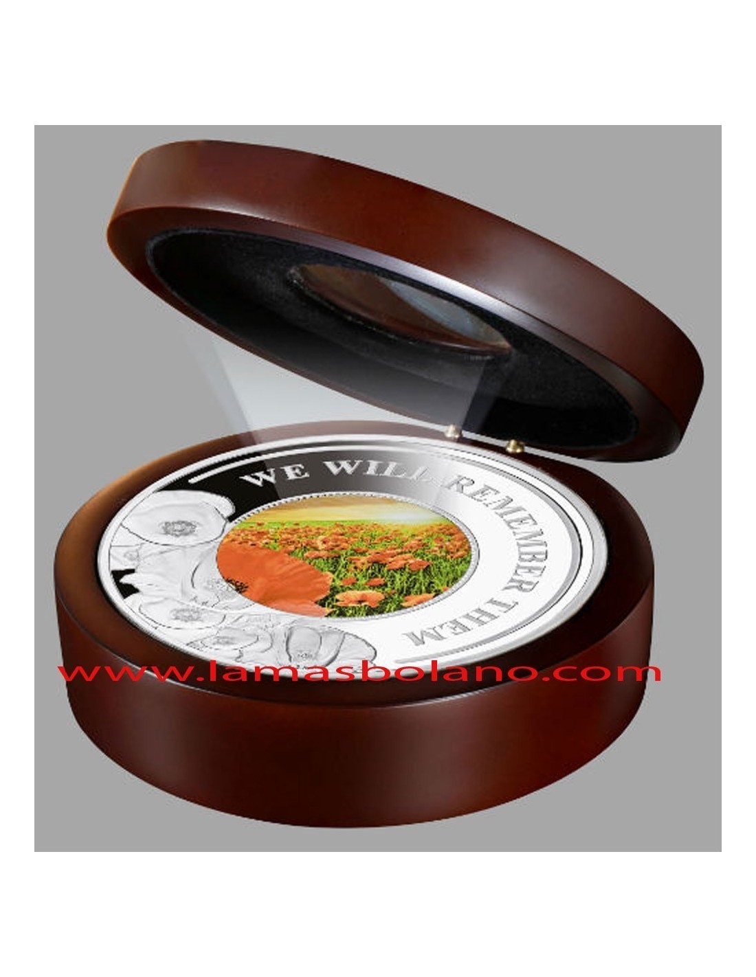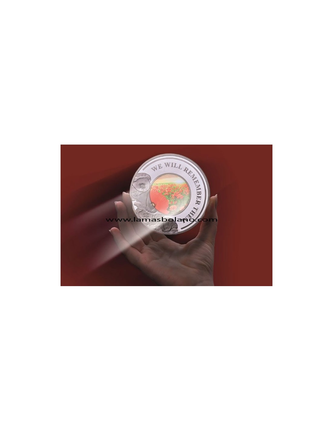 Moneda dedicada al Centenario de la Primera Guerra Mundial y presenta a la Amapola Roja, símbolo en la cultura anglosajona para conmemorar a los soldados caídos. 5 Onzas en Plata 999% Proof a color con incrustaciones de vidrio coloreado. El estuche lleva integrado un interruptor con luz. El Anverso de la moneda muestra un campo de amapolas a color en el centro. Rodeando la moneda varias amapolas y la leyenda WE WILL REMEMBER THEM. El Reverso de la moneda muestra el mismo campo de amapolas a color en el centro, y rodeando la moneda el país emisor, el año de acuñación, el valor facial, el peso, la composición y la efigie de S.M. la Reina Elizabeth II. Con una tirada de 500 unidades se acompaña de su estuche y certificado oficial.