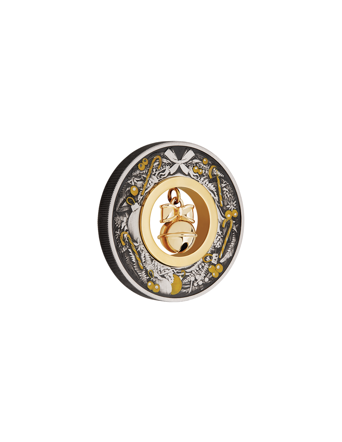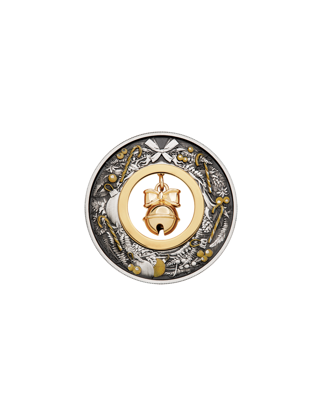 El Anverso de la moneda muestra una corona navideña compuesta por una cinta, muérdago, piñas y un anís estrellado. Los elementos adicionales incluyen bolas decorativas doradas, bastones de caramelo y bayas navideñas. En el centro de la moneda hay un cascabel chapado en oro de 24 quilates. El Reverso de la moneda , diseño de Jody Clark, muestra la efigie de Su Majestad la Reina Isabel II de Inglaterra, el peso, la pureza, valor facial y el año de acuñación. Moneda de 2 Onzas en Plata 999% con un acabado antiguo y una tirada de 2.500 monedas