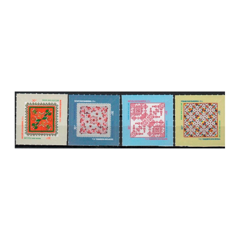 Bordados de Mari, Tatar, Chuvash y Carelia. Serie completa de 4 valores autoadhesivos. Pequeña doblez en el valor del bordado de Carelia.